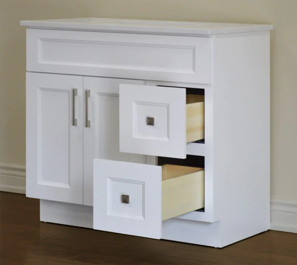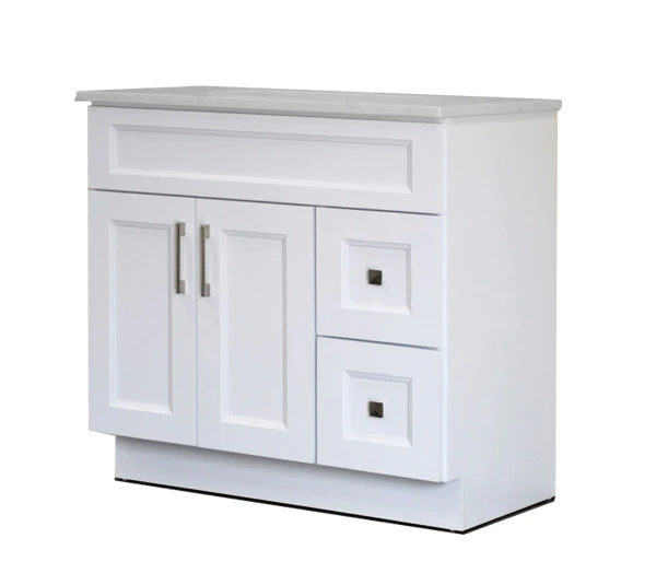 About this item 36″ Solid Wood Vanity in White Shaker Specifications: Size: 36” W x 21” D x 34 ½” HComes with Quartz Top & Sink Features: • 2 Doors• 2 Drawers **can be left hand/right hand• Top Blank*Faucet sold separately** Quartz top color can be selected upon pick up.