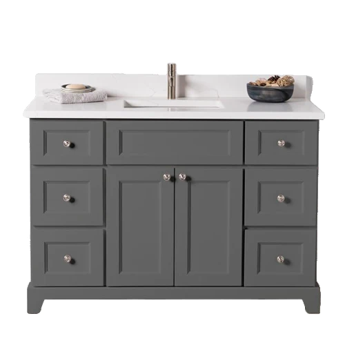 About this item 48″ Solid Wood Vanity in Step Grey Specifications: Size: 48” W x 21” D x 34 ½” HComes with Quartz Top & Sink Features: • 2 Doors• 6 Drawers (3 Drawers on each side)*Faucet sold separately** Quartz top color can be selected upon pick up.