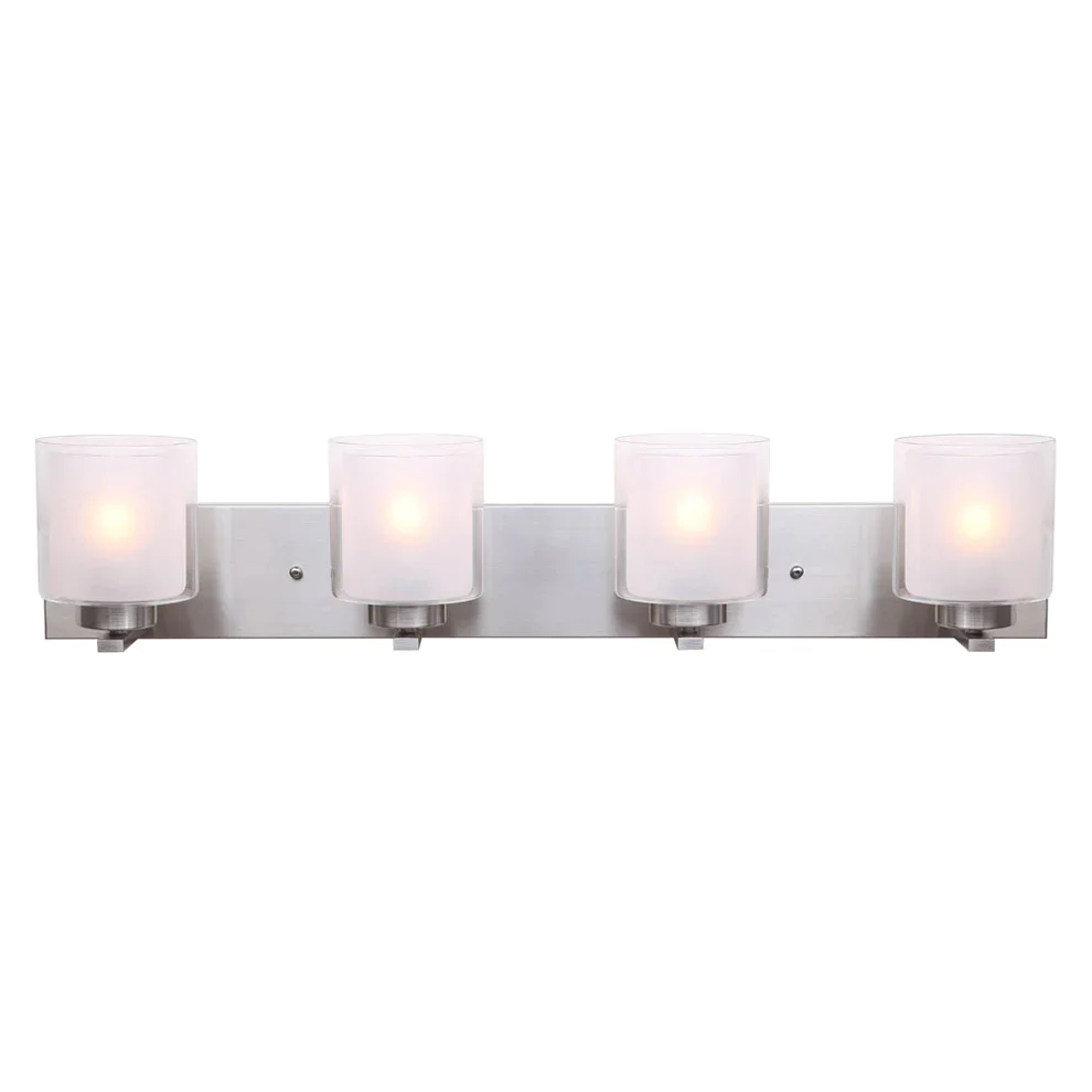 The Pearson 4-light vanity light features a brushed nickel finish. PEARSON, Spec. IVL591A04BN, 4 Lt Vanity, Double Glass of Clear&Frosted, 100W Type A, 32″ W x 6 1/2″ H x 6 3/4″ D