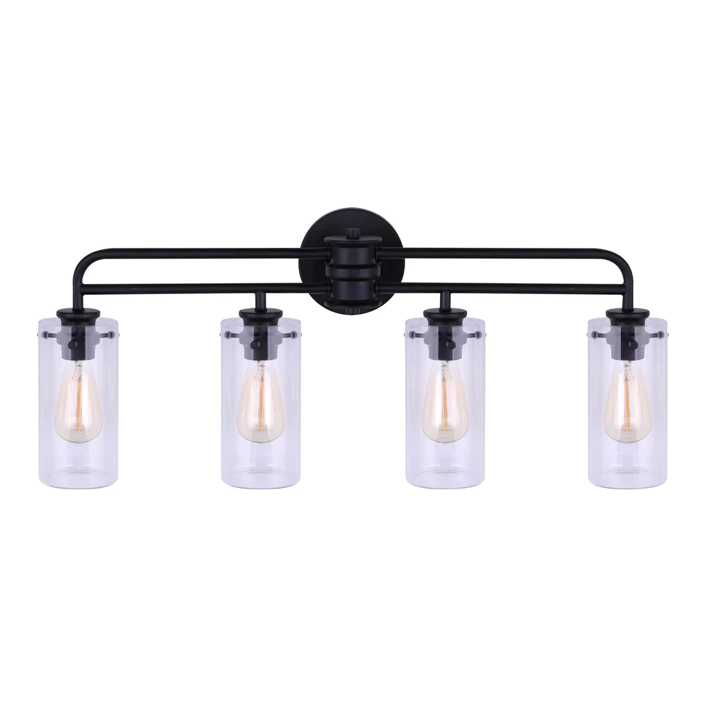 The Sutton 4-light vanity features a matte black finish with clear glass shades. 60W B-ST64-17C bulbs included. 31 1/4″ W x 13 1/4″ IN H x 6 1/2″ D. Easy Connect Included