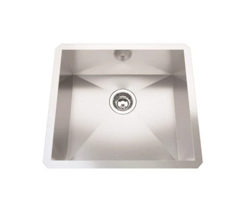 - Hand fabricated 20 gauge stainless steel undermount sink with zero radius corners, and easy to clean satin finish inside and out