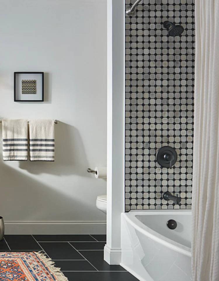 Model: 82770BL About this item: matte black finish is the perfect complement to modern spaces. lever handle makes it easy to adjust the water. install with Posi-Temp® pressure balancing control valve to maintain water. temperature control in the shower. 4.5″ diameter spray head. 7 1/2″ tub spout length complies with…