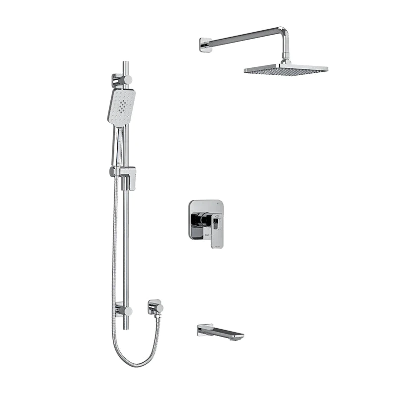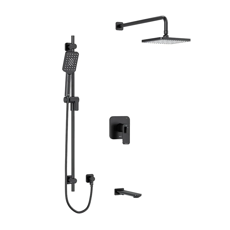 - Type T/P (thermostatic/pressure balance) ½” coaxial 3-way system with hand shower rail, shower head and spout